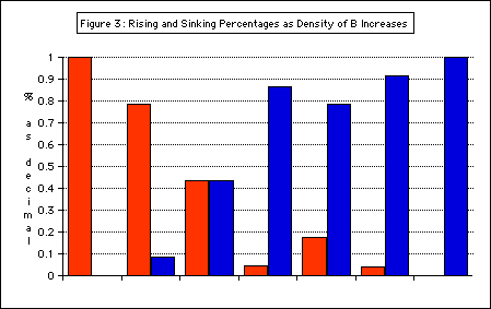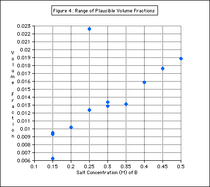 In theory, equilibrium would be considered achieved when the antibubble neither rose or sank. However, in practice, antibubbles rarely stay stationary in the bath. For every antibubble that formed, it was recorded on which drop it was formed and whether it rose, sank, or sank and then rose. Most of the time, antibubbles did not form on the first drop. Additional drops were added to each test tube until an antibubble formed. This was repeated f or each solution of liquid B. Concentrations of salt in liquid B ranged from 0.15M to 0.50M NaCl, by 0.05M increments. The highest and the lowest B densities that would form an antibubble that sank and/or rose were used to calculate the range of plausib le volume fractions of air in the antibubble using Equation 3.